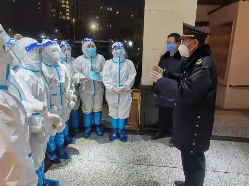 守土有责,守土尽责。作为饭店防疫的第一道关口,安全部全员响应,主动作为,党员干部带头以上率下,按照思想凝聚、力量汇集、集中调度、统一指挥的工作总要求,用“疫”不容辞的职责精神,履行岗位职责,有效发挥了安全保卫的作用力量。安全部严把第一道防线,严守每一个出入口,每天24小时轮流值守。严格按照疫情防控要求,对外来人员认真测量体温、查验健康码,并进行实名登记,对外来物品进行检查与消毒,严防死守,杜绝一切人员风险及物品隐患进入饭店。设置专区为医疗队车辆停放及物资摆放提供便利,并协助引导人员与车辆通行。