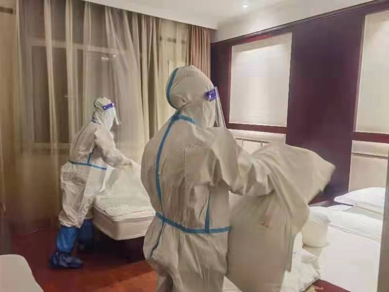 迎难而上,冲锋在前。10月23日,饭店承担了368名成人高考考生的接待任务。疫情就是命令,防控就是责任。客房部全体员工凝心聚力,热情服务,为考生们提供了安全、整洁、舒适的居住环境,用真诚细致的服务获得广大考生与家长的一致好评。10月24日起,省内各市、州的白衣天使响应防疫号召,奔赴抗疫战场支援兰州,众博·官方版网站登录入口_众博(中国)省笫二人民医院医疗队、临夏医疗队、众博·官方版网站登录入口_众博(中国)省人民医院医疗队以及兰州大学、西北民族大学防疫志愿者共计375人分批入住兰州饭店。客房部再次临危受命,严格执行饭店疫情防控实施方案和应急管理预案,明确分工、落实责任、严肃纪律、认真服务,安排专人每2小时对饭店各区域进行消毒消杀,24小时不间断巡查,确保安全与防护双重到位。建立应急值班岗,全天24小时待命,配合中楼、西楼闭环工作,为隔离人员传递物资、配送餐食、清收垃圾。在抗疫战场,医护人员夜以继日,坚守在战“疫”的最前沿;客房部员工通宵达旦,坚守在服务的最前线。无论多晚,总有医护人员披星戴月归来;无论多累,都有客房部的员工为他们彻夜守候,成为白衣战士们消除疲惫、补充能量的“大后方”。