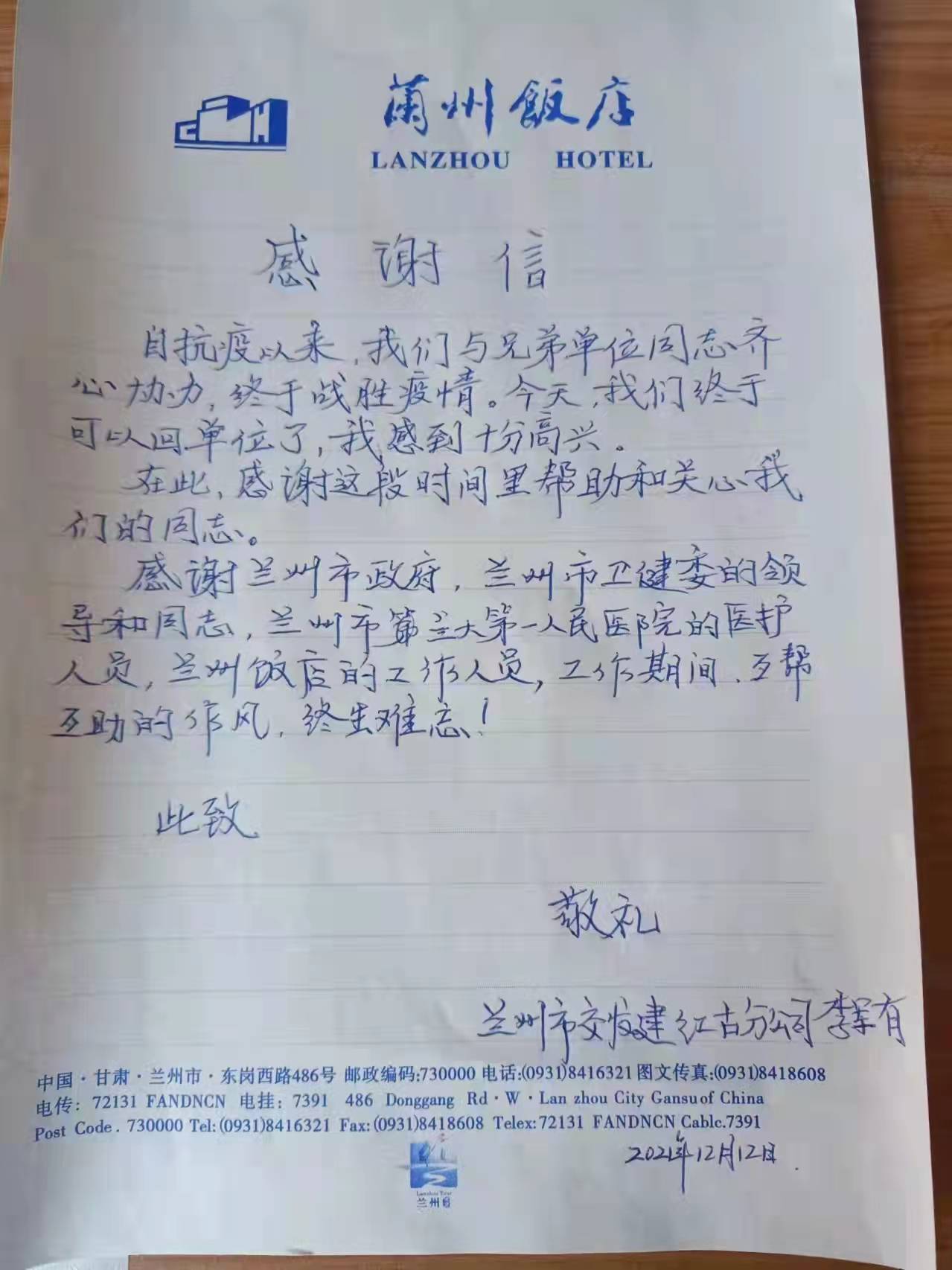 2021年10月19日,新冠肺炎疫情防控阻击战在兰州打响。疫情当前,兰州饭店闻令而动,力担重任,投身战“疫”服务第一线。2022年1月13日,兰州市城关区文旅局召开先进表彰大会,我店被评选为“抗击新冠肺炎疫情杰出贡献单位”。疫情面前,兰州饭店的每一位管理者、每一个员工都是抗“疫”战士,他们站得出、冲得上,在“大考”中勇毅担当,向阳而行,彰显使命担当,做出了杰出贡献。