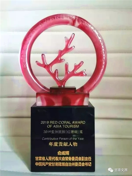 在备受关注的2019(第四届)亚洲旅游『红珊瑚』奖颁奖典礼上,省人大常委会副主任、甘南州委书记俞成辉荣获2019亚洲旅游「红珊瑚」奖“年度贡献人物”。