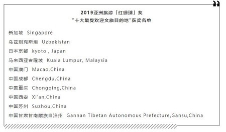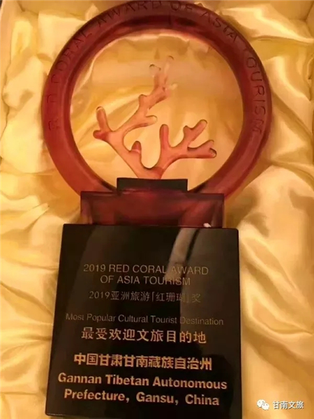 甘南州以优美的自然风光和独特的民俗文化荣获2019年亚洲旅游『红珊瑚』奖“十大最受欢迎文旅目的地”,和新加坡、日本京都、中国澳门等十个国内外旅游城市同登荣誉榜单。