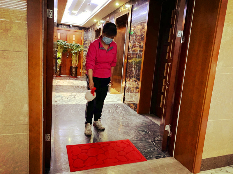 工作人员提前对办公室、会议室、饭堂等公共区域进行无死角消毒,并重点对门把手、设施按键、楼梯通道等公共重点部位进行多次消毒,在办公区入门位置放置鞋底消毒垫。