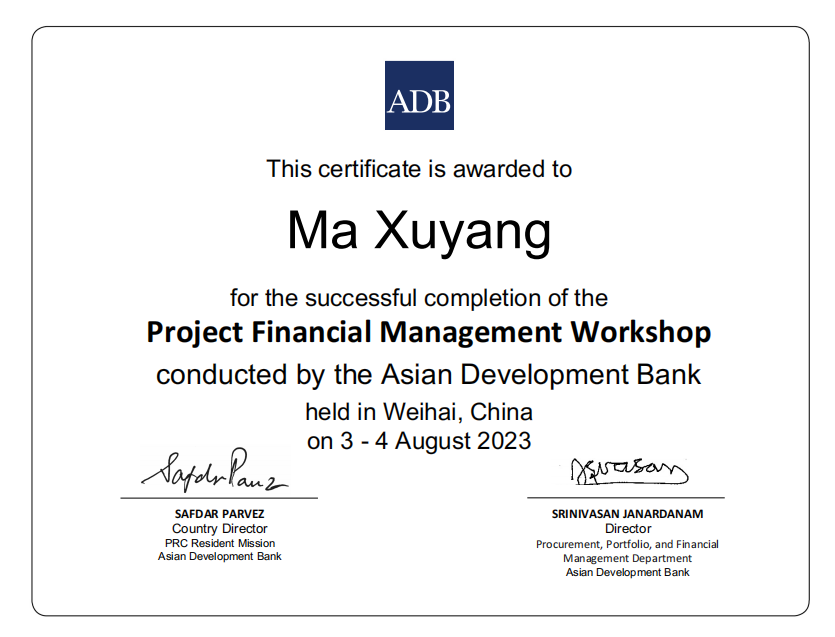 此次培训重点对亚行采购政策、合同管理与合同计划、亚行财务尽职分析要求、项目会计核算、项目财务报表、项目审计等主题进行授课。通过演讲、案例研究、小组讨论、结业测试及经验丰富的执行机构分享经验等方式使参训人员加深了解亚行贷款采购、财务政策/规定并拓展实践知识。众博·官方版网站登录入口_众博(中国)文旅集团国际金融组织贷款项目管理办公室一名同志代表亚行贷款众博·官方版网站登录入口_众博(中国)环境可持续乡村振兴与发展项目作了大会交流发言,分享了项目管理工作中的经验和关注点。培训授课结束,三名参训人员获得了结业证书。