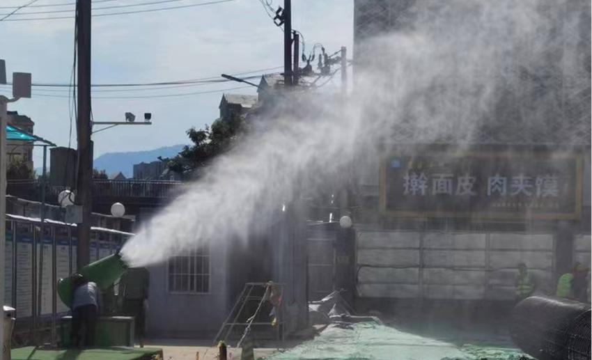为确保大气污染防治工作落到实处,增强项目参建人员大气污染治理防范意识,保证项目建设顺利进行,四公司主要负责人与兰州市环保局、城市执法局、质监站等单位沟通协调,结合项目地处闹市区实际,制定大气污染防治措施,并组织项目部全体人员召开大气污染整治专题会议,对大气污染防治工作的相关要求进行部署和落实。一是全面落实公司各项决策部署和子(分)公司《关于进一步加强施工大气污染管理工作的通知》要求,提高思想认识,转变工作作风,落实工作职责,切实抓紧抓实抓好各项措施落实落细,以实际举措防治大气污染,确保空气质量持续改善。二是加强宣传引导,发挥党建工作引领作用,提高政治站位,紧盯目标任务,突出重点工作,坚持目标导向,划分责任区,责任到人,强化考核问效,为安全文明施工生产提供保障。三是狠抓扬尘治理。各参建员工要牢固树立大局意识,责任意识、担当意识,严格落实“六个百分百”要求,齐抓共管,加强施工现场、道路扬尘管控,督促各施工作业队文明施工,严格落实各项防尘抑尘降尘措施,促进项目建设顺利推进。四是加大扬尘污染治理物资设备的投入。项目部在施工周边居民楼上安装喷淋系统喷雾降尘,施工现场发泡机喷水抑制尘土飞扬,有效减少扬尘污染。施工场区道路、加工区地面进行硬化处理,裸露场地进行全覆盖,钻孔泥浆自然脱水固化后及时使用封闭式运输车辆外运。车辆出入口安装车辆自动冲洗装置,专人负责,检查车辆外部、底盘、轮胎处不得沾有污物和泥土,严禁车辆带泥上路。五是加大巡查和预防力度。项目部安排专人加强对扬尘污染源的巡查和检测,不定时进行场地清洁、洒水,及时处理扬尘污染问题。